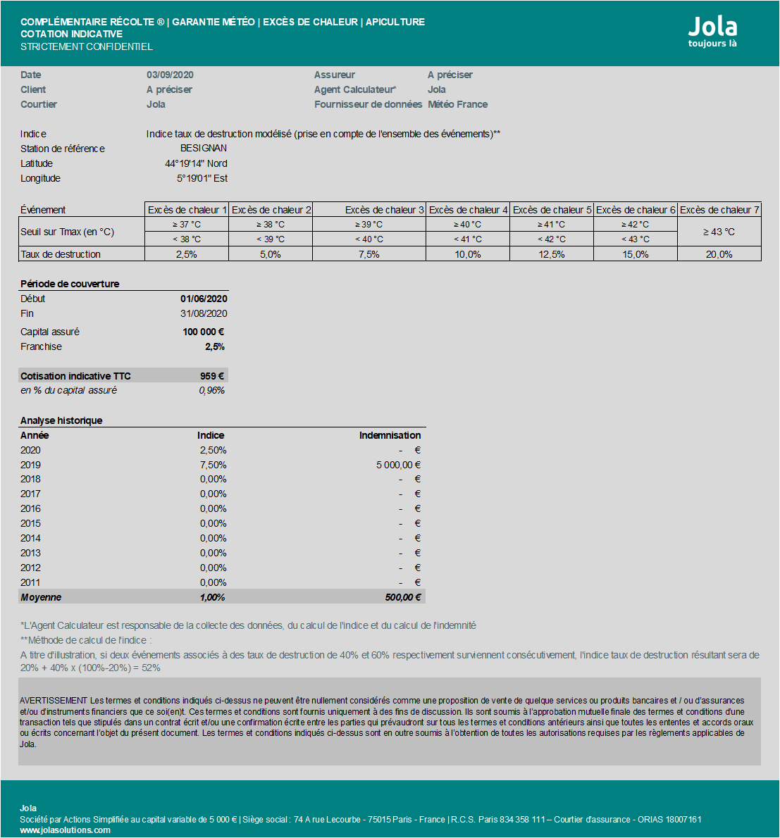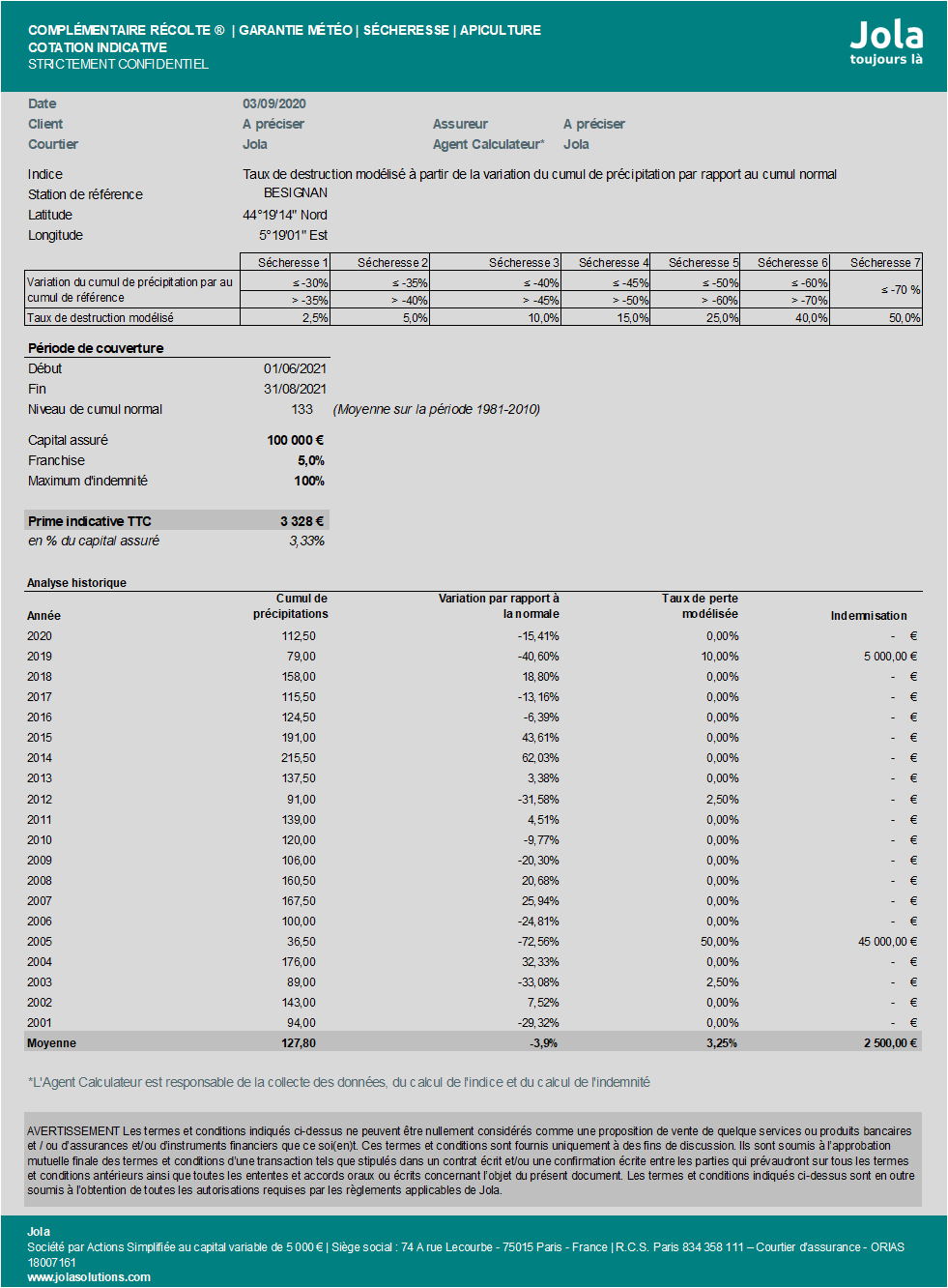 [Jola et Client] Définition des paramètres : période de risque, station météo de référence, événements couverts, taux de destruction associé