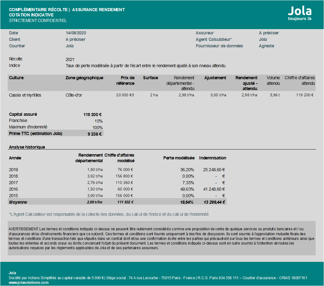 Afin de se prémunir de tout risque affectant la production de cassis sur une zone étendue, une assurance contre une baisse du rendement départemental peut également être mise en place grâce à l'offre Complémentaire Récolte ®.