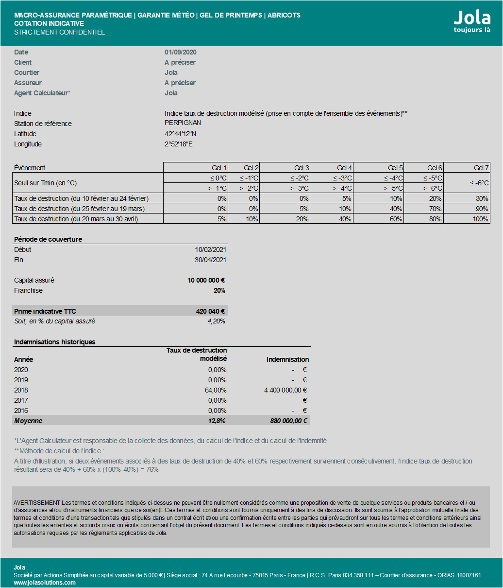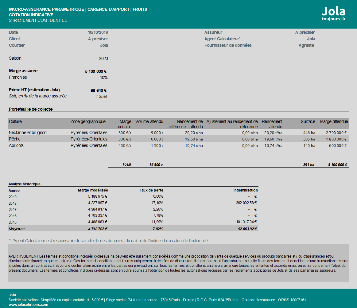 En tant que courtier d'assurance spécialiste de la gestion des risques en agriculture, Jola a constuit une offre d'assurances non traditionnelles pour protéger la marge des industriels de l'agroalimentaire. Appelées macro-assurances paramétriques, ces assurances se déclenchent automatiquement en fonction de données de référence extérieures et fournies par un tiers de confiance : rendements Agreste, prix ou qualité FranceAgriMer, observations météo de Météo France ou d'un fournisseur privé de stations connectées, etc.