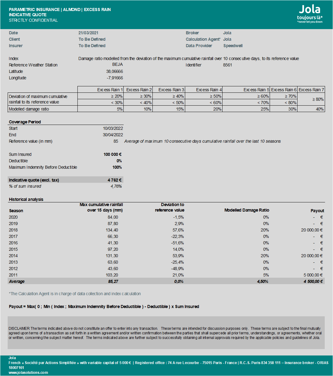 [Jola & Client] Definition of cover parameters : coverage period, reference weather stations, covered events, associated damage ratios