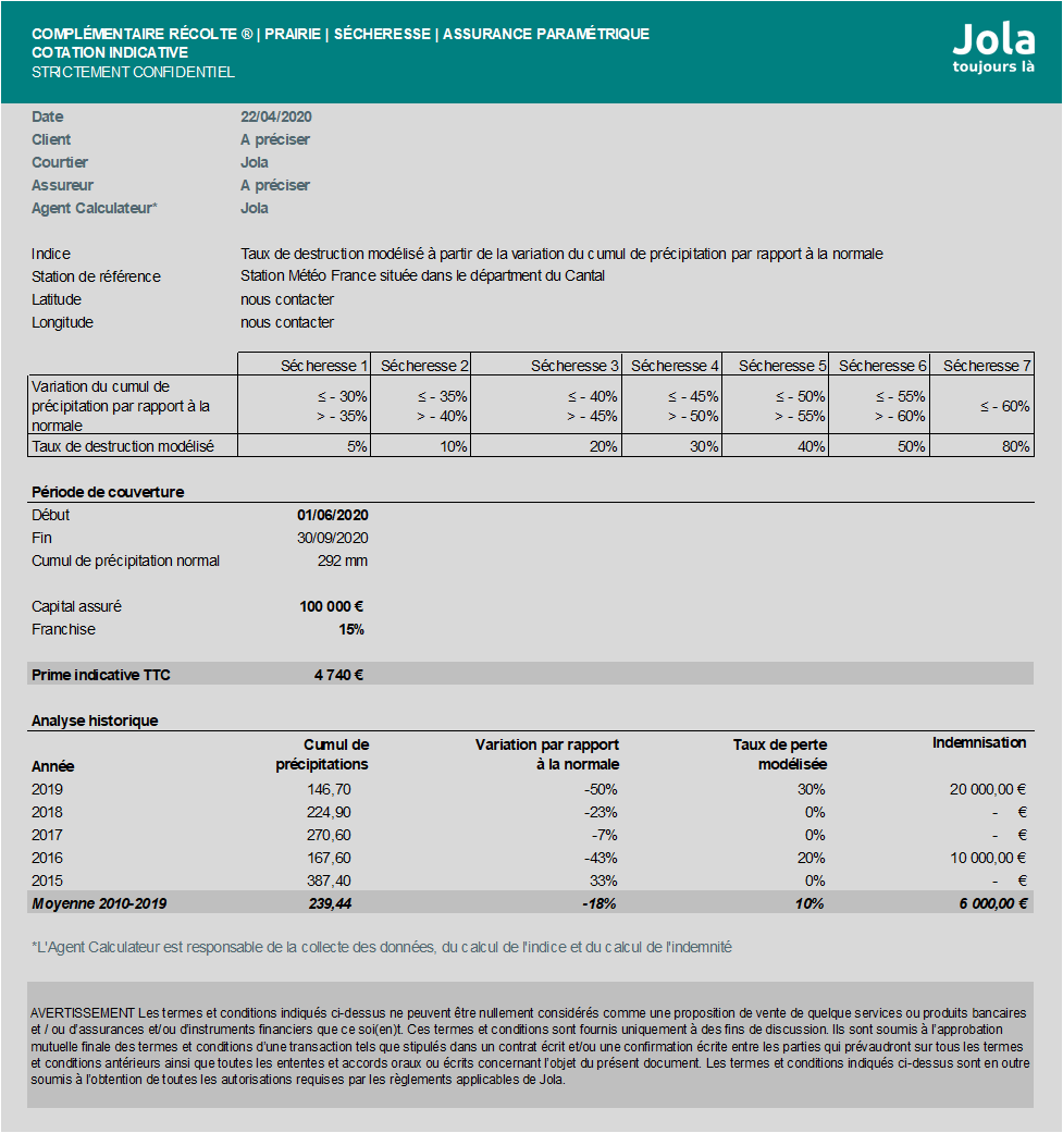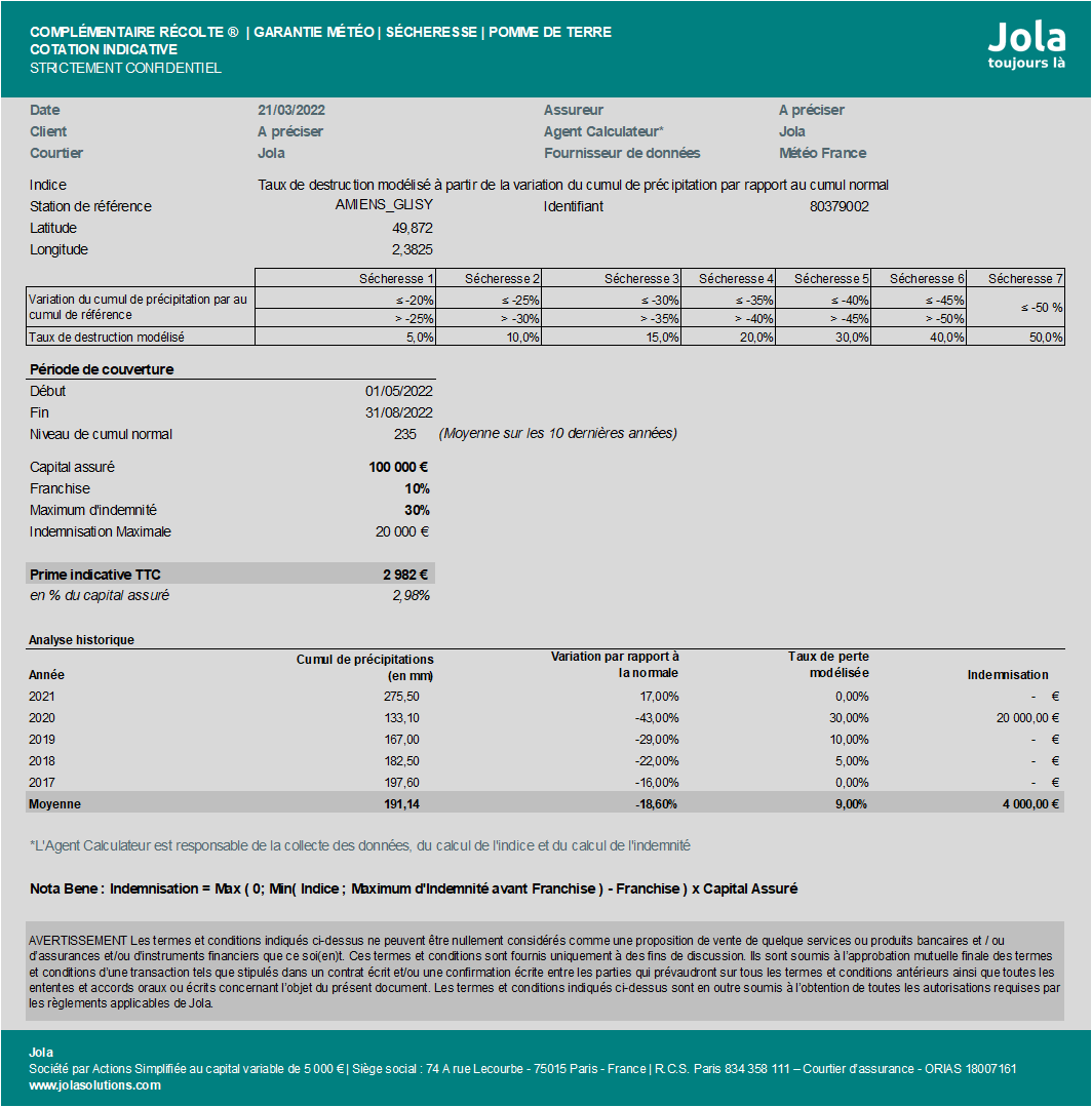 [Jola et Client] Définition des paramètres : période de risque, station météo de référence, événements couverts, taux de destruction associé